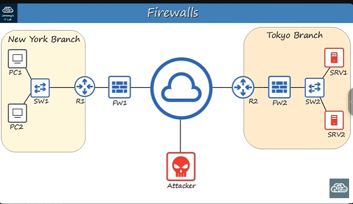 PC2 ─┤ SW1 ── R1 ── FW1 ═══════════════ FW2 ── R2 ── SW2 ├─ SRV2